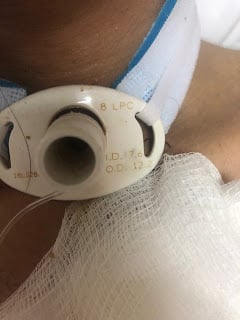 Initially, we fed him through a feeding tube until he was able to swallow. Then after talking through his care with an ENT doctor in the States, we changed him from cuffed collar (inflates to block airway) to an uncuffed trach collar. This was done to allow him to start to breathe around the tracheostomy tube, allowing air to pass through his vocal cords and bypass the tracheostomy hole.