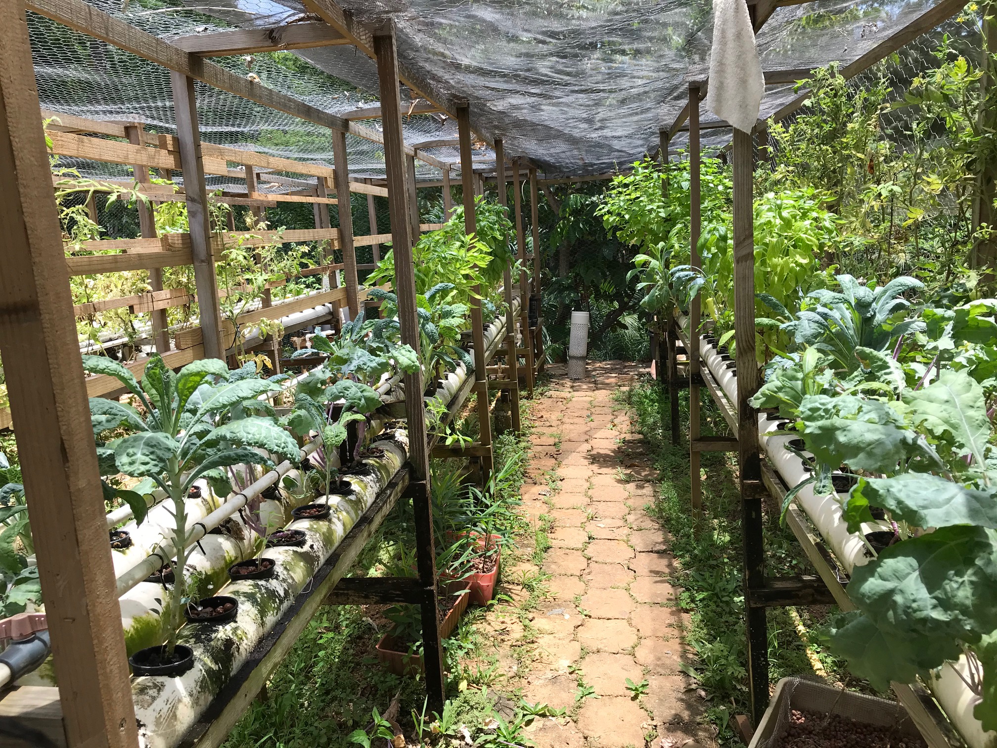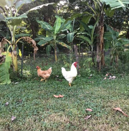isolated spot on the edge of the jungle. When we moved out here from Balfate many years ago, once out of the jungle behind us, the ground was stripped-bare slash and burn scrub cow pasture. But I began planting things. And, this is the tropics. Things grow fast….and it is a very different place now 17 years later. I planted this Ceiba tree for instance, when it was small enough that I could jump over it. In the early morning while the coffee is brewing, I go let the chickens out of the pen. Otherwise that stupid rooster, Señor Pompadour, just keeps crowing his head off. After devotions, I go walk through the orchards, and the banana groves, feed the tilapia, and work in the hydroponics garden. These activities are not really work actually, more like meditation while harvesting food. Between the fish and the chickens, the bananas, pineapples, avocados and manzanitas, and all the vegetables that the garden produces, we have not really needed to leave to get food. (Which is a good thing since we can’t technically go into a grocery store in La Ceiba until the last number of my ID matches the allowed number for travel).